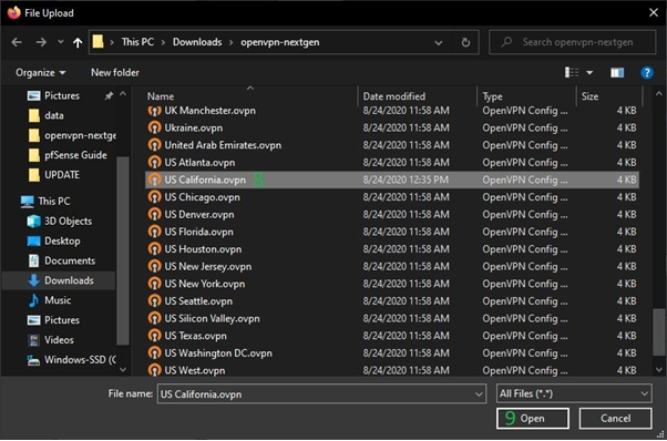 Before starting, be sure you have downloaded the configuration file you would like to use for your connection. For this guide specifically, we have used the California file from the collection labeled Default, be sure to decompress the file so you can access the contents.