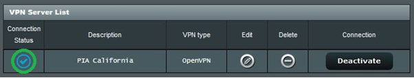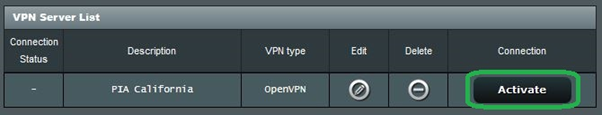 1. Now that you have created the VPN configuration, it will be shown in the VPN Server List; click on Activate to start the VPN connection. It may take a few moments to connect, and you will see a small animated icon in the Connection Status column. Once the connection is established, the Connection Status column will show a check-mark.